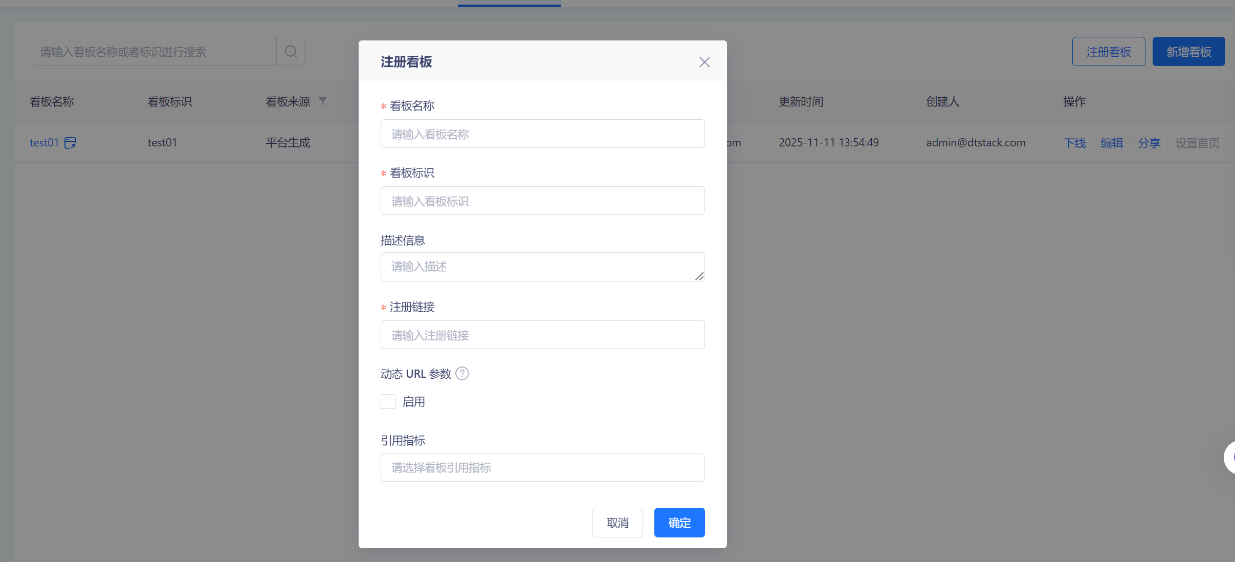 指标应用-指标看板增加「注册看板」功能,默认admin、租户所有者、租户管理员、项目所有者、项目管理员、数据开发、运营人员、访客有权限。