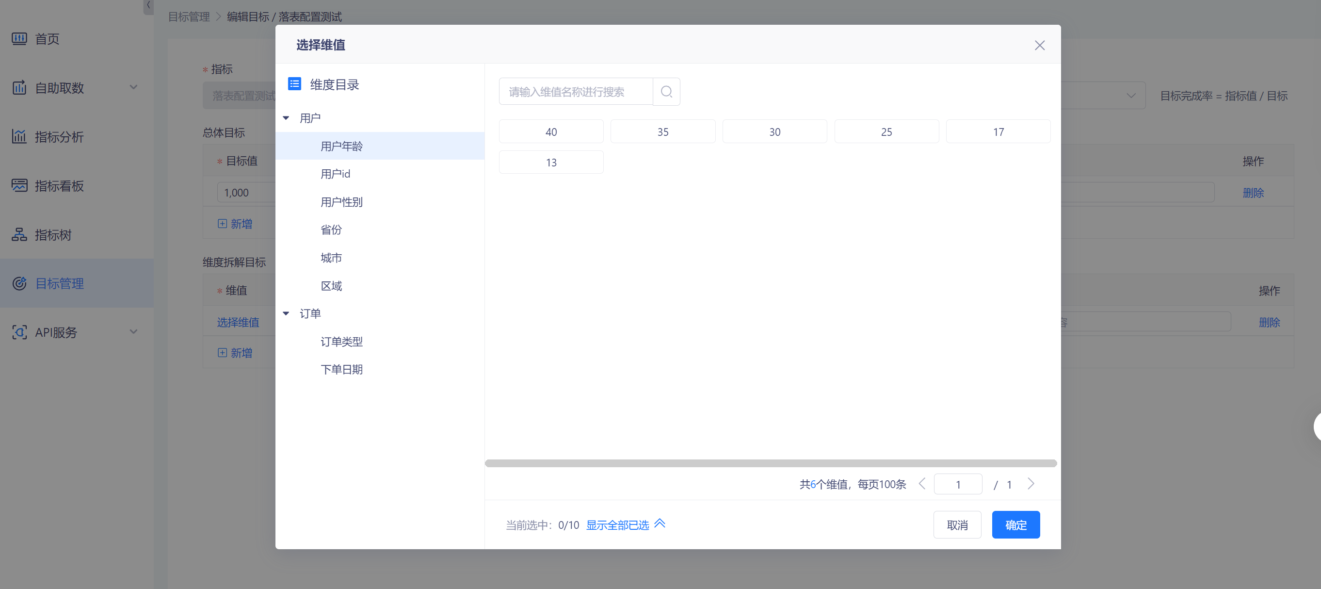 - 维值拆解目标中,维值选择时,支持一个值选择或者模糊搜索。