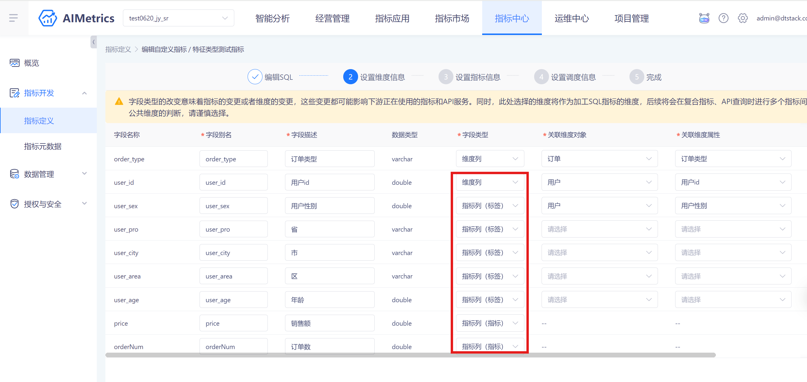 编辑完sql后,下一步需要对sql中的输出字段进行设置,需要用户针对输出的字段,指定字段类型是「维度列」、「指标列(指标)」、「指标列(标签)」
