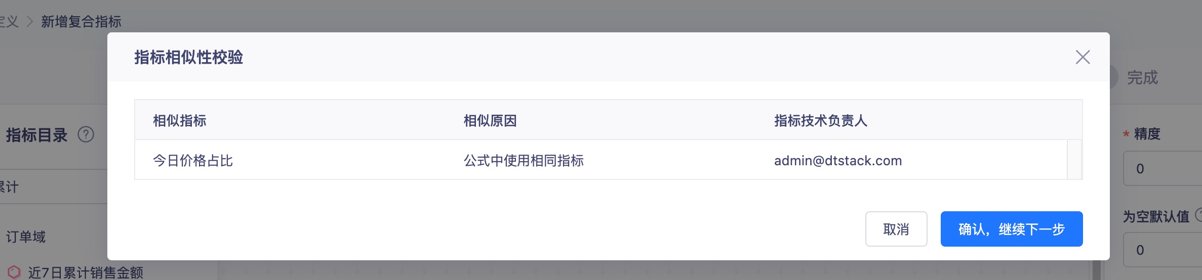 配置指标技术信息时,系统会针对指标相似性做校验,对于相似指标会做提示,若用户认为该可接受相似指标的存在,则可忽略该提示继续配置。目前系统会对如下相似场景做相似性提示: