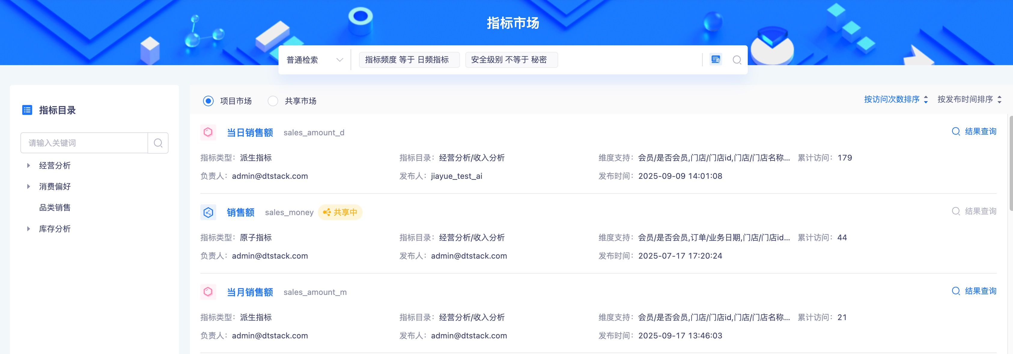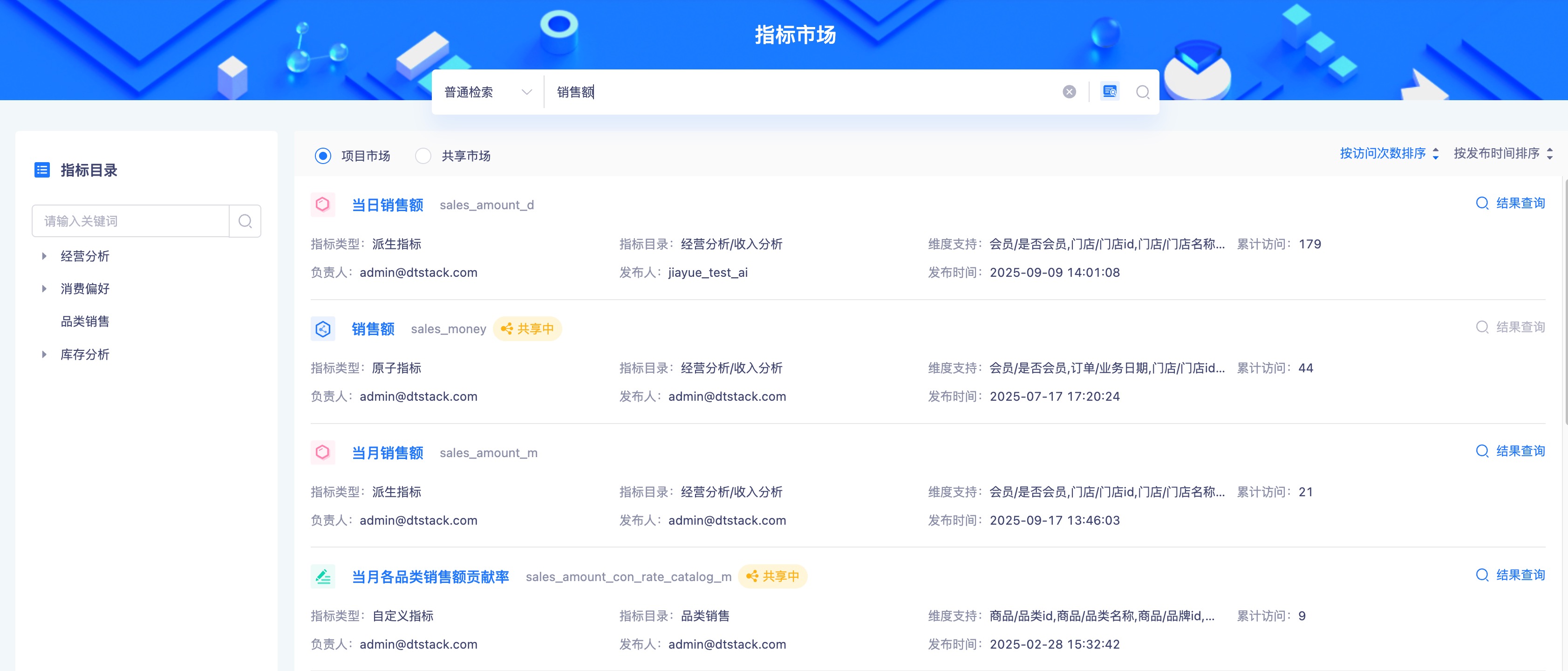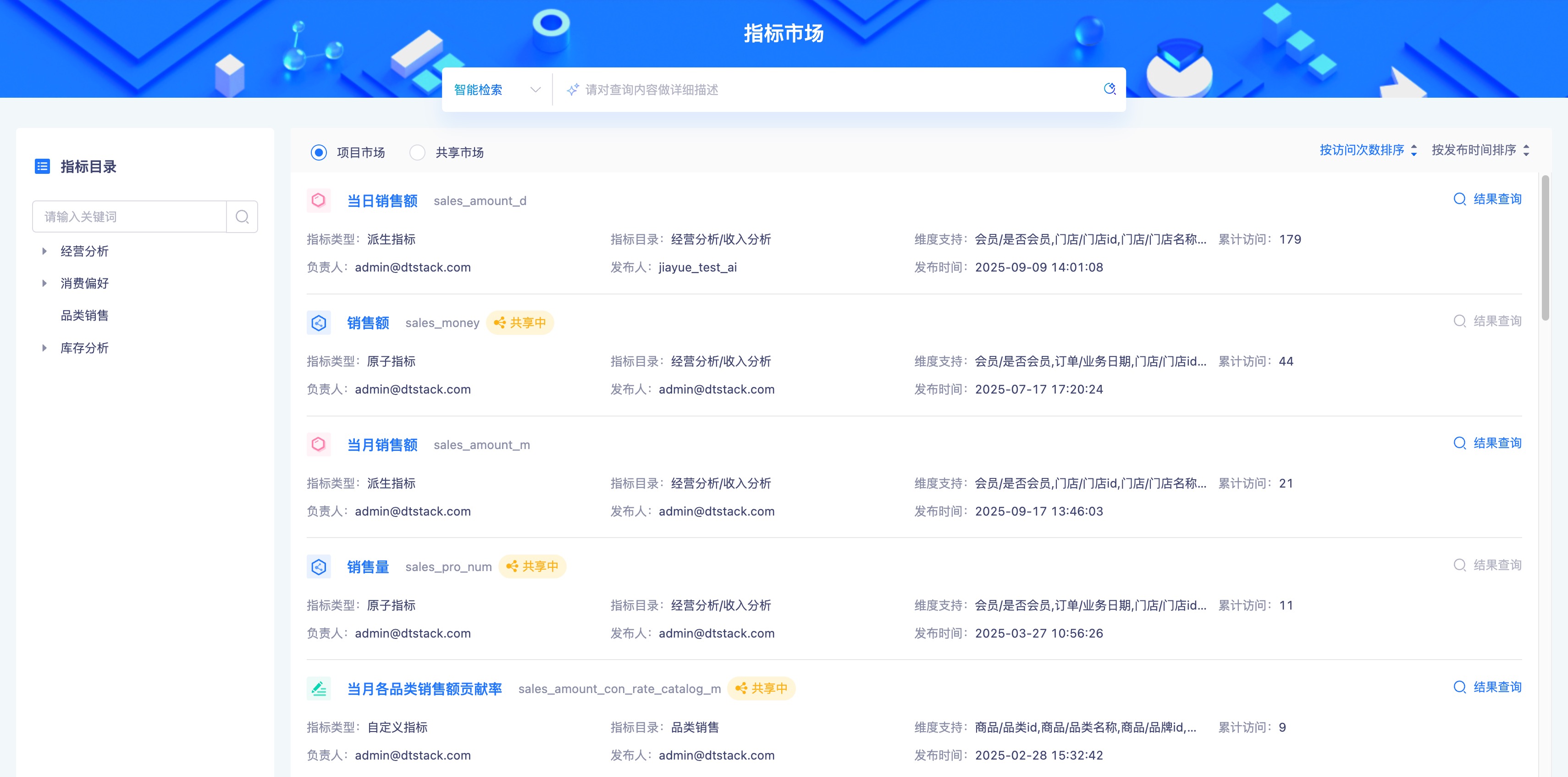 平台开放指标市场,提供指标信息的综合查询,方便获取指标的相关信息,包括名称、描述、分类、维度、更新时间等,通过指标市场,统一用户对指标资产信息的认知,避免线下沟通所带来的一些信息不对等,消息滞后等问题。