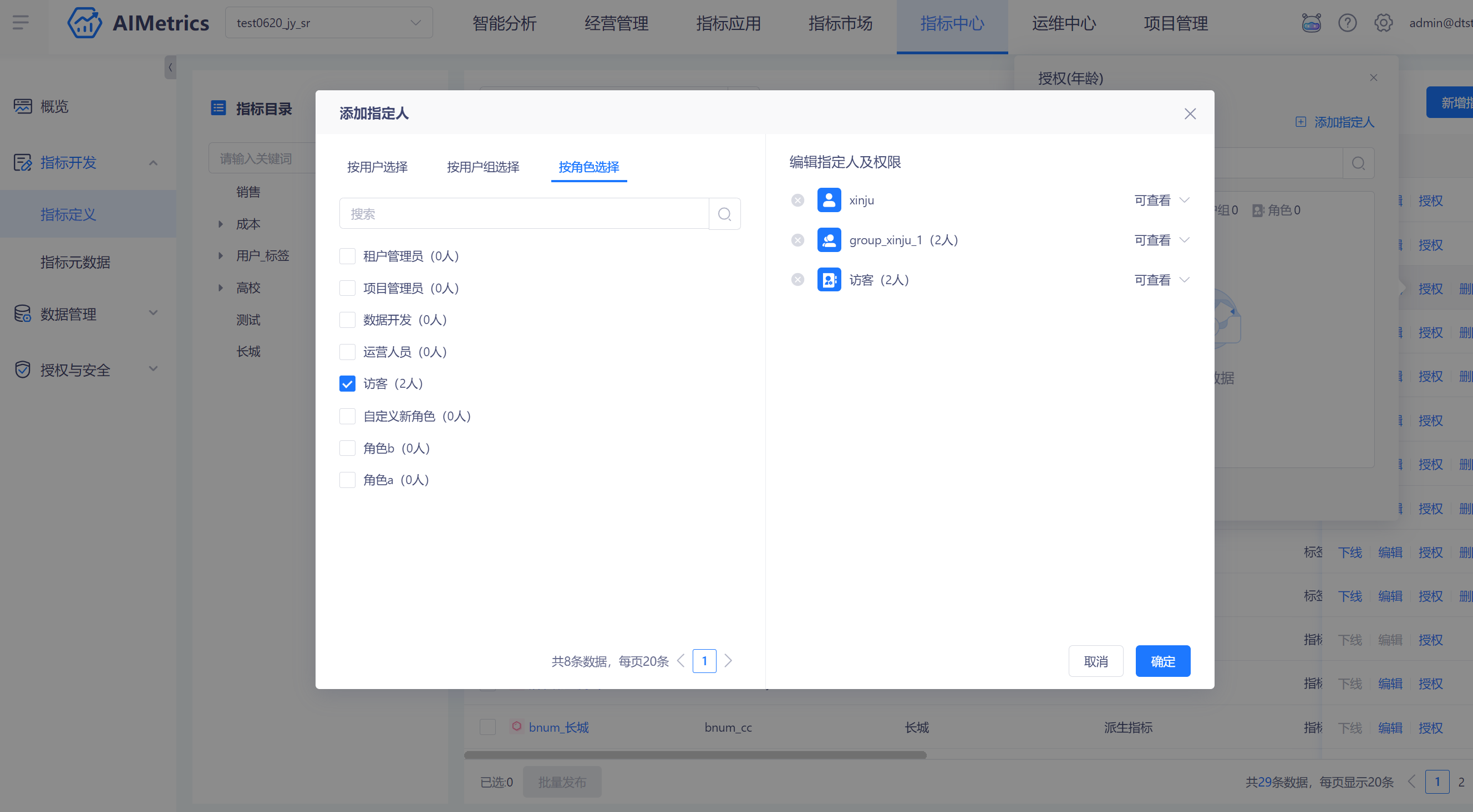用户在授权指标权限的时候,需要添加指定人,可根据用户、用户组或角色进行授权,选中的用户、用户组或角色将被添加到右侧编辑面板,授权可查看或可编辑权限。