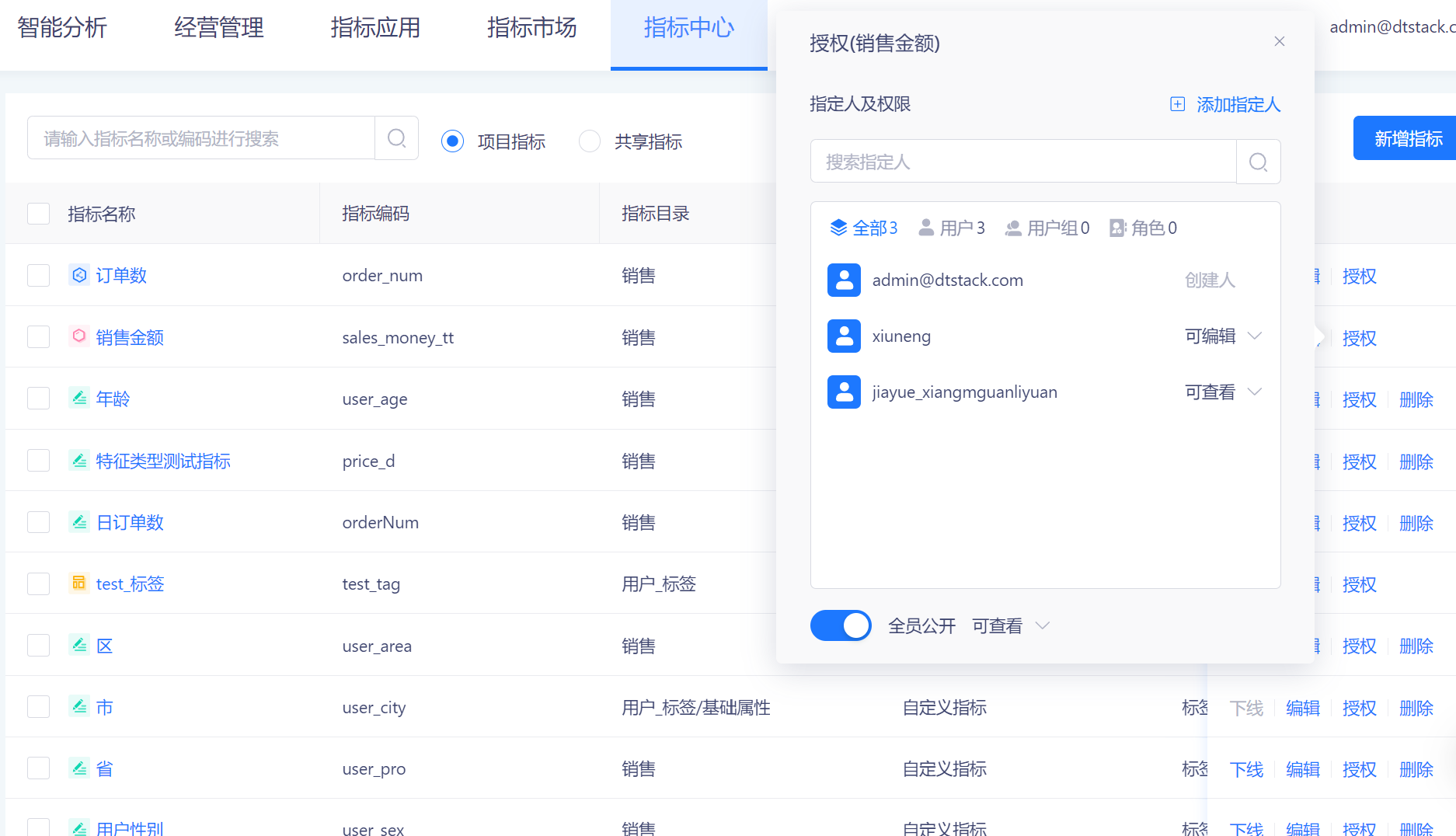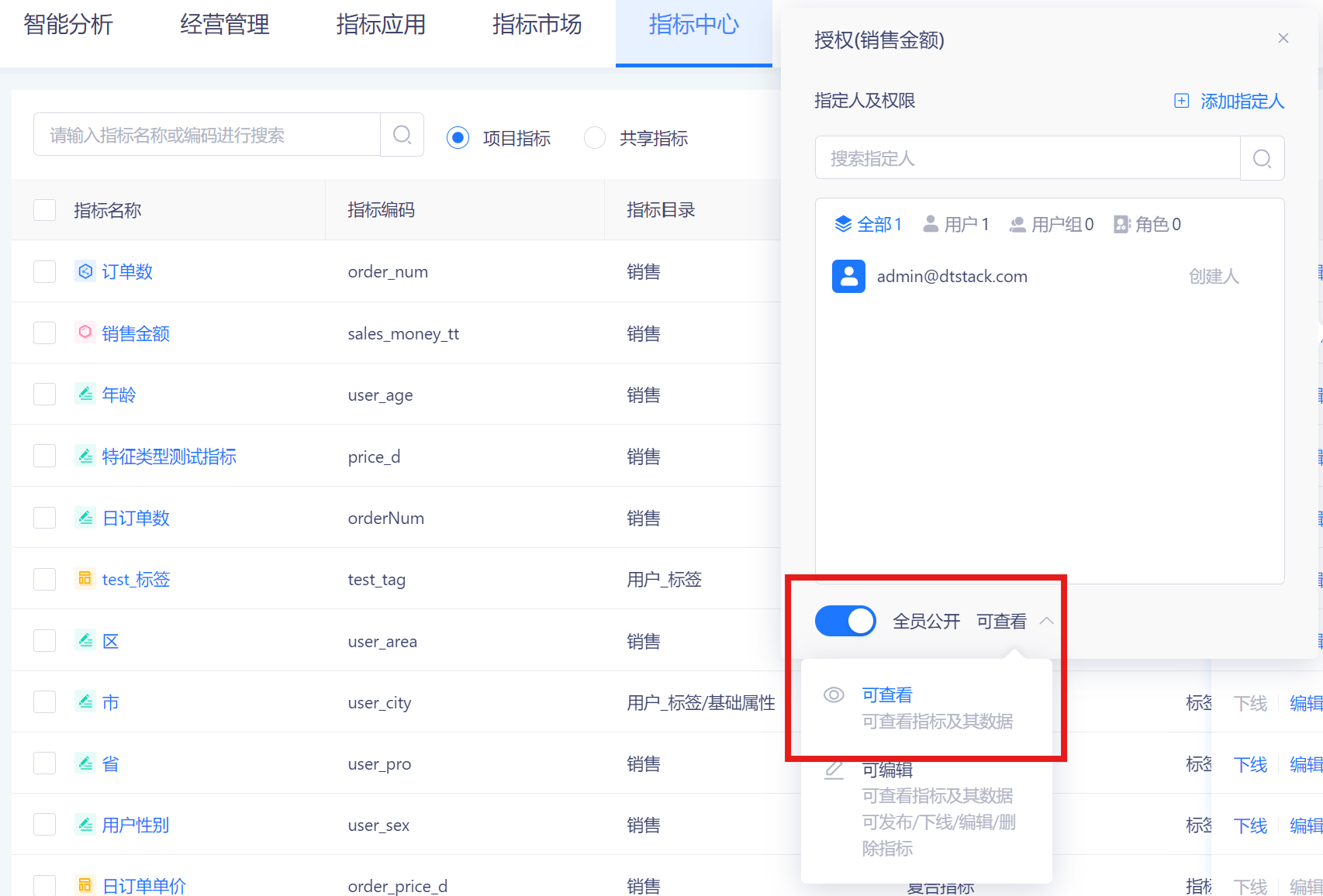 如果不需要对指标做权限控制,则可开启「全员公开-可编辑」;如果全员可见,但需要控制个别用户的编辑权限,则可以开启「全员公开-可查看」,然后在页面单独设置用户的「可编辑」权限;关闭「全员公开」后,指标会根据授权页面的用户权限进行控制。