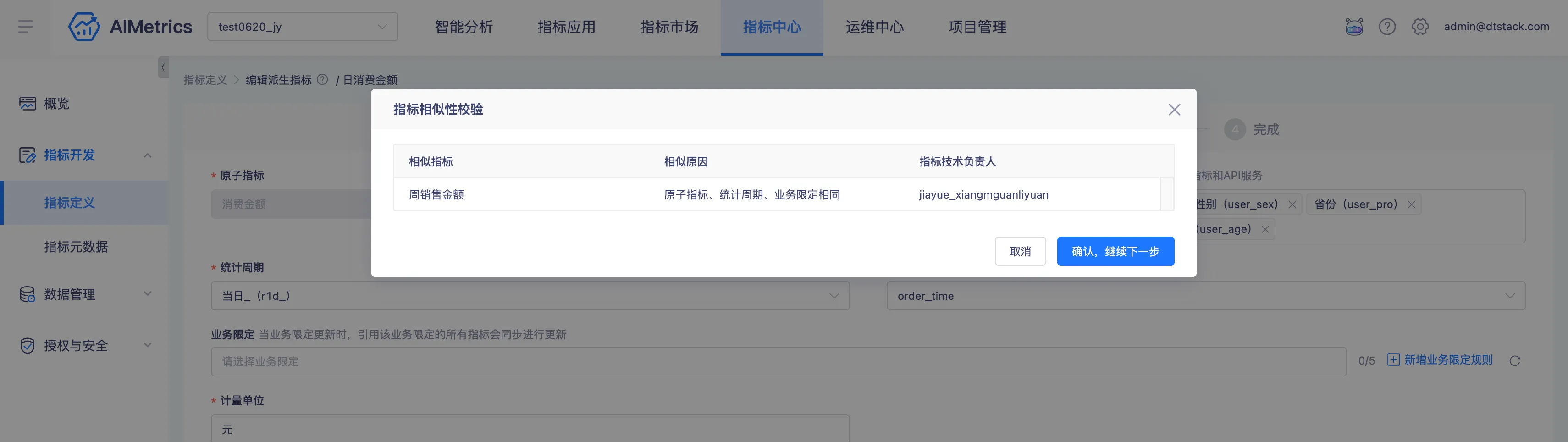 功能: 模型、指标、业务限定创建/编辑的过程中,会针对技术口径的相似性做基于规则校验,本校验只做相似性提示,不强制限制用户创建指标。
