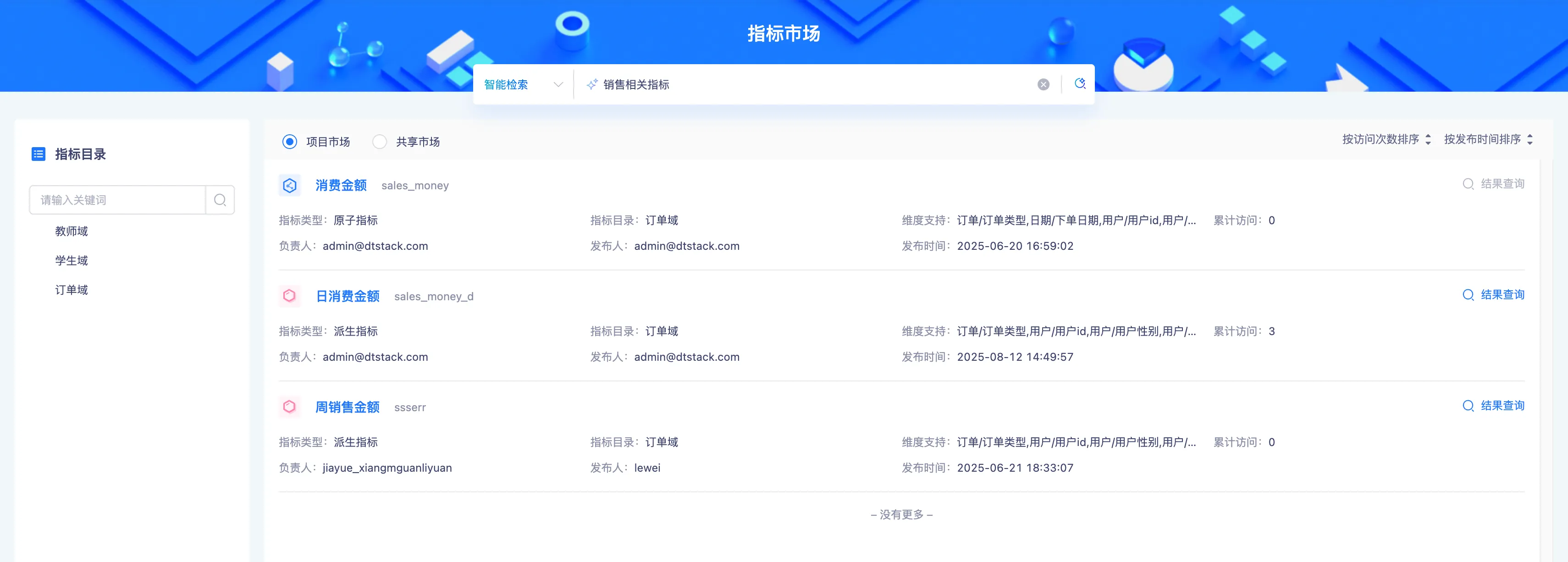 指标市场做指标检索时,可以切换到「智能检索」模式进行AI检索,此时会基于用户查询内容做语义层的转换,查询相关度高的指标返回