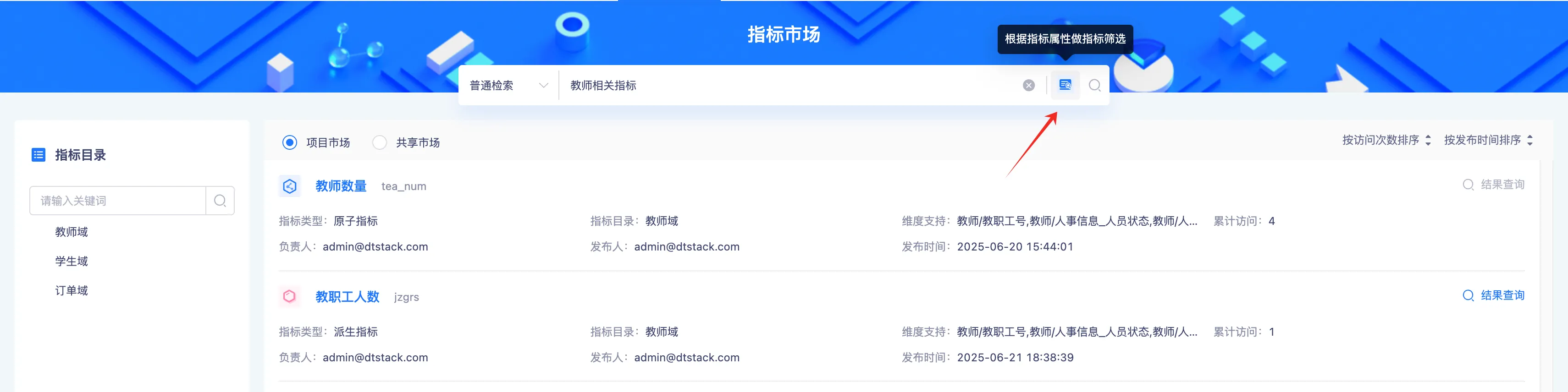 指标市场做指标检索时,可以切换到「普通检索」的高级模式中进行基于指标属性的检索