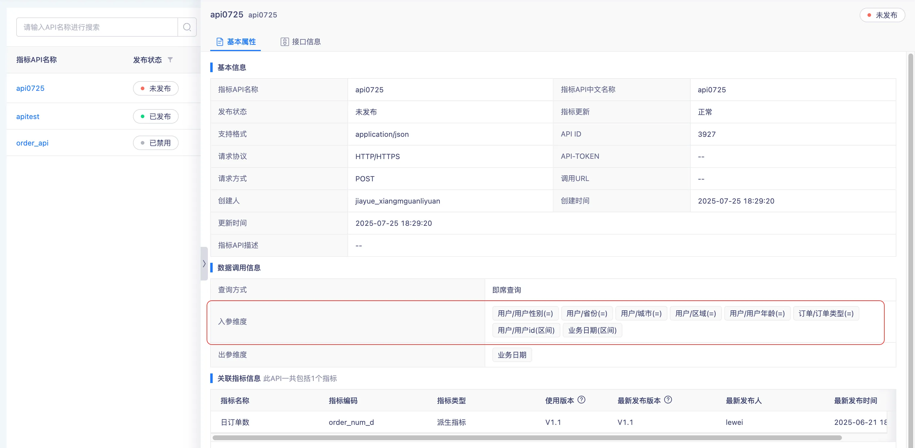 入参维度信息查询通过API详情-基本属性中的入参维度查看