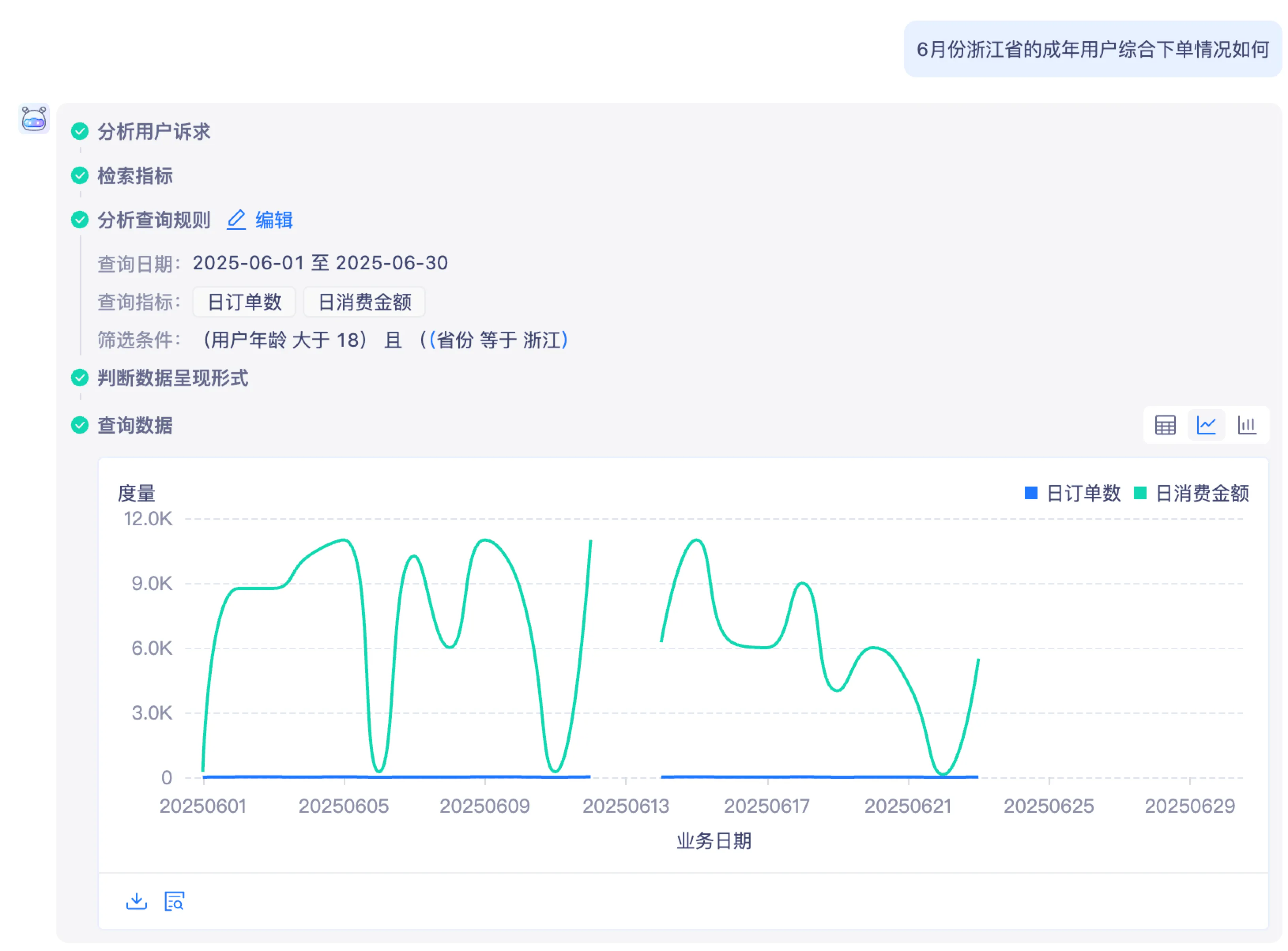 如:用户提问6月杭州的销售情况如何,AI则会基于「销售情况」模块取6月份杭州的销售金额、销售订单量数据进行结果呈现。