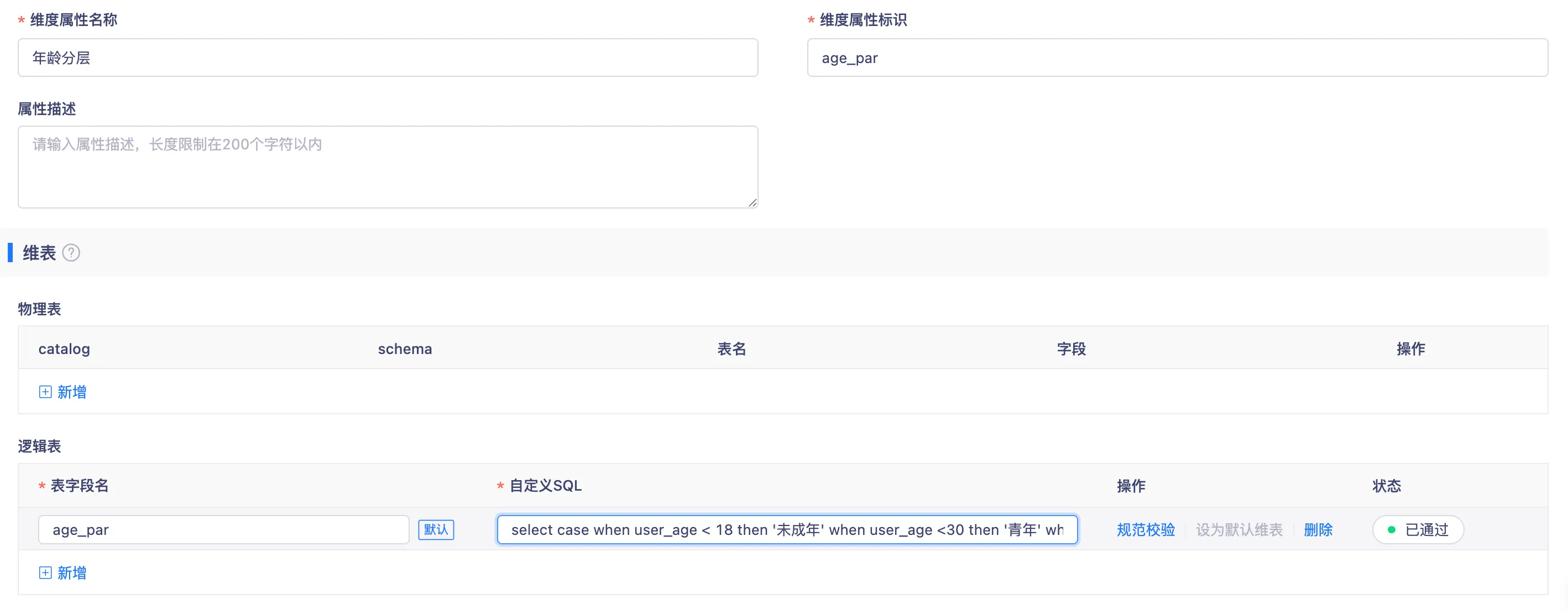 维度定义可能会基于某个字段做二次加工形成一个衍生维度(如:基于年龄字段生成年龄段维度)或是对维值范围做个限定(如:所有指标只统计有效订单内容),这类场景优先通过开放自定义SQL方式实现,后续实现可视化配置方式。
