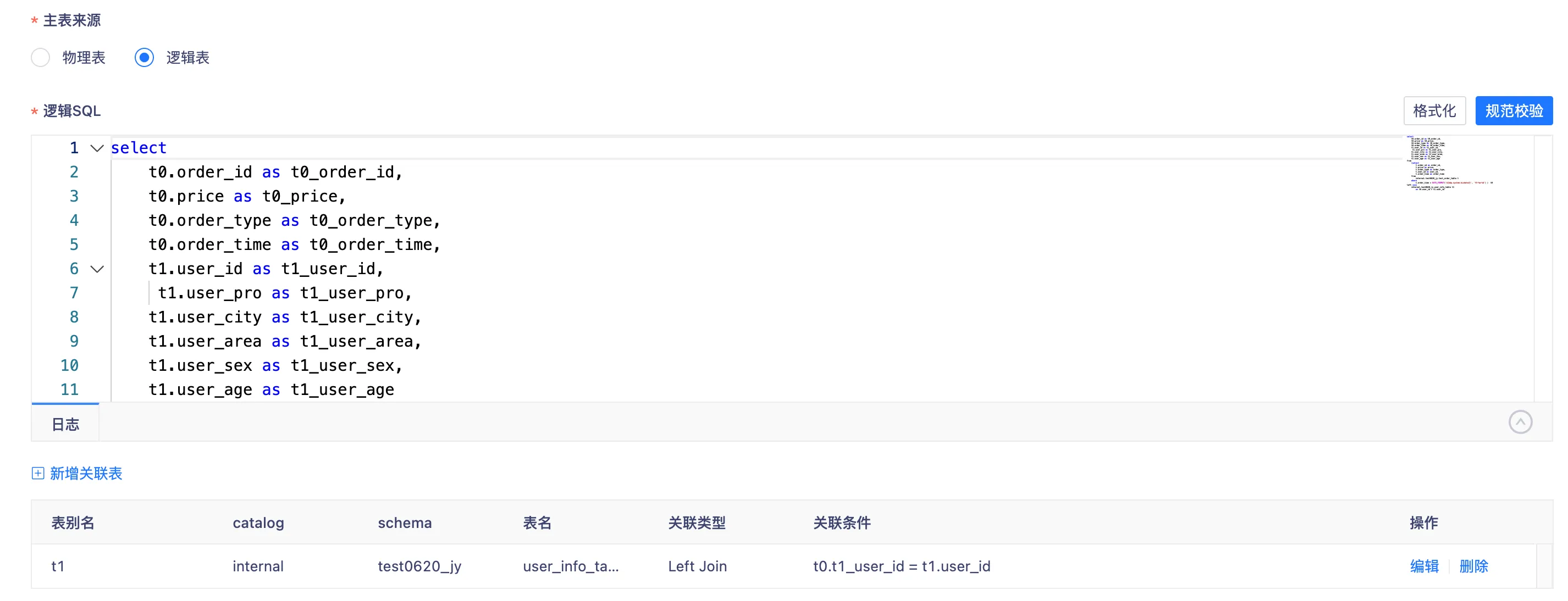 数据模型,支持基于SQL定义主表。主表来源选择为逻辑表时,即可通过自定义SQL方式定义主表。主表的表别名统一为t0