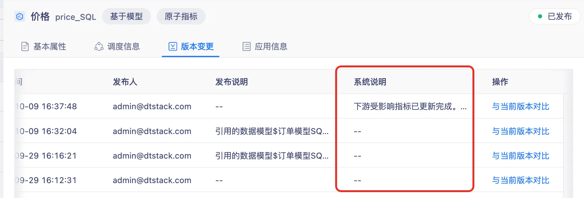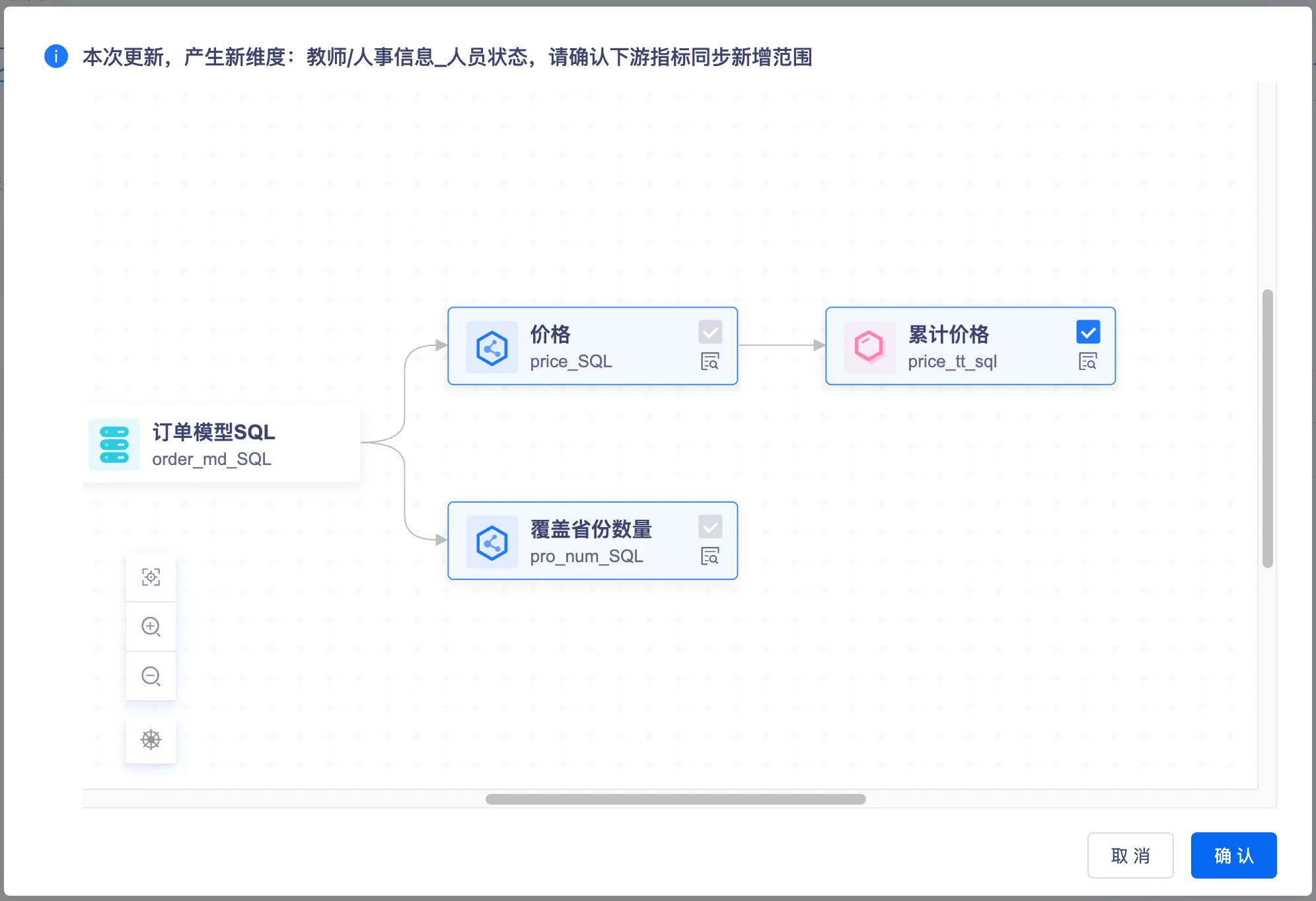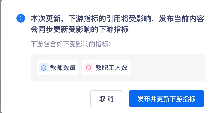 - 数据模型/业务限定/统计周期/指标的技术口径变更后,下游触发的联动更新范围可在弹窗中查看