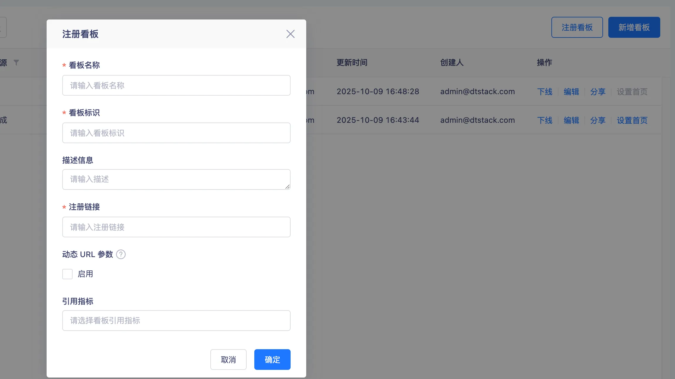 - 注册的看板在填写看板名称等基础信息的基础之上,填写注册链接即可完成看板的注册。若涉及数栈和看板所在平台的用户对接,则可开启动态URL参数配置,填写参数名后,系统会在填写的看板地址基础上,拼接动态参数值信息再进行链接跳转,以实现跨平台的用户对接。引用指标用于对看板使用的指标范围做说明,后续基于看板做智能分析时,将基于此处定义的指标范围进行问答。