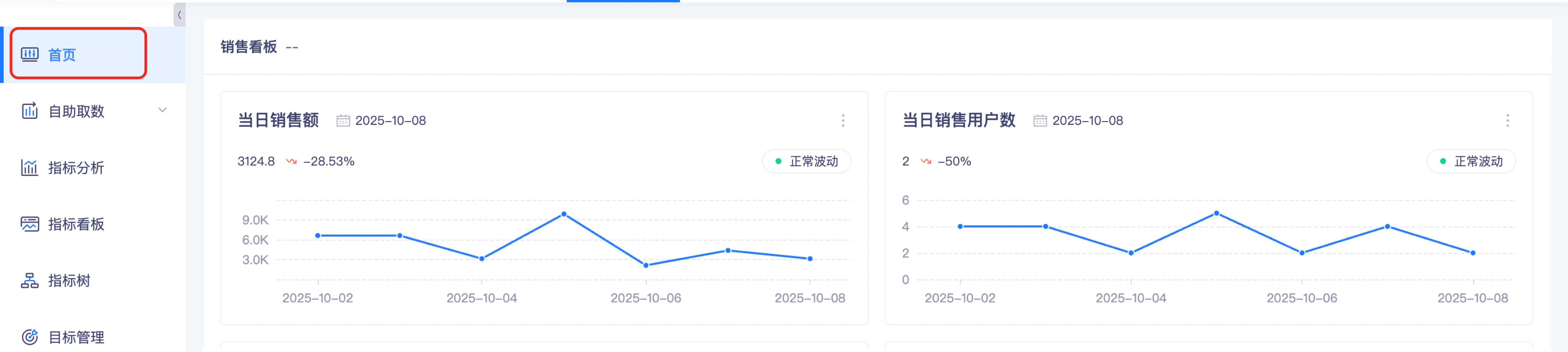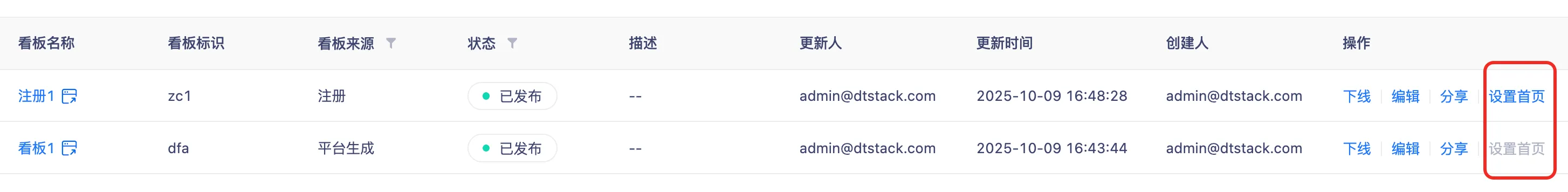 - 指标看板页面选择某个已发布的看板,操作「设置首页」,将其设置为首页默认展示的看板内容
