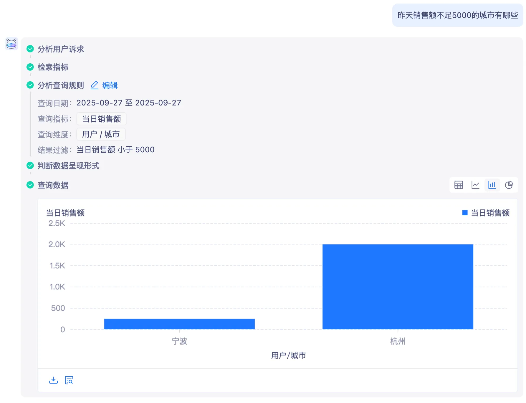 AI问数支持对单指标查询结果进行过滤的提问场景,例:昨天销售额超过100的城市有哪些?