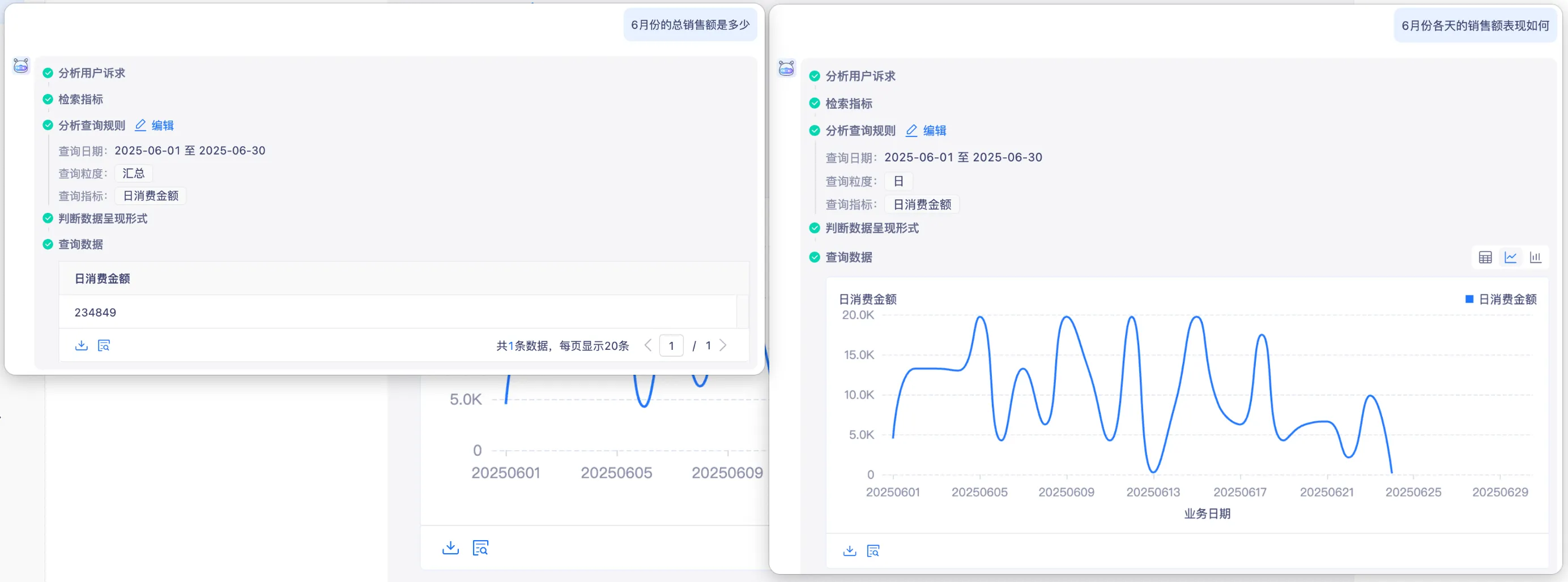 - 平台AI问数的解析规则增加查询粒度解析,查询粒度支持查询按日统计数据或所选时间段的汇总数据